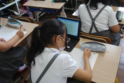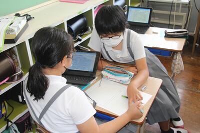 1学期末に学校で行うことの一つに「1学期を振り返って」の作文を書く学習があります。1学期を振り返ってがんばったことや、2学期にがんばることについて、振り返りを行いました。学習のことや学校生活のこと、委員会活動のことなどについて、タブレットPCに入力したり原稿用紙に書いたりしました。終業式当日には5年生の代表者が発表しました。