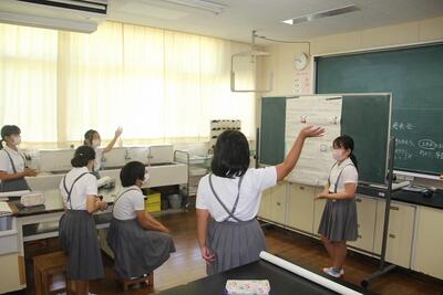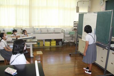 理科では、夏休みの宿題の一つだった自由研究の発表を行いました。ミニトマトの甘さ、飲み物などの凍らせ方、ショウガ湯の効能、バターの作り方、スライムのかたさなど、児童が自主的に考え研究しました。発表後には、聞いた児童からお返しの言葉を伝えました。楽しい発表会になりました。