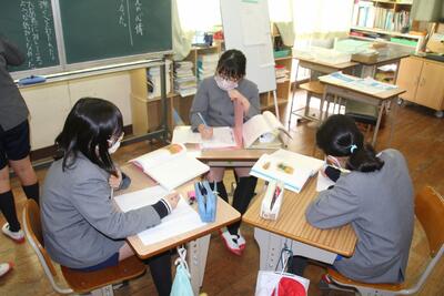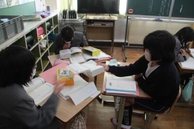 国語科では、椋鳩十作「大造じいさんとガン」を使って、すぐれた表現に着目して読み、物語のみりょくをまとめる学習をしています。この日は、登場人物「残雪」の行動の様子と「大造じいさん」の心情の変化について考えました。グループに分かれて4つの場面についてまとめました。大造じいさんの心情の変化やそれを表す情景の表現について学習を進めます。