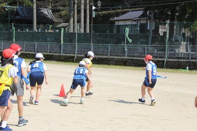 体育科では、タグラグビーの学習をしています。ラグビーのタックルの代わりに、腰につけたタグ(はちまき)を取って守るというゲームです。4年生時に経験があるので、ボール保持者の後ろについてパスを受けて、攻撃する形はできつつあります。タグを取られた瞬間が守備側の人数が減るので、スペースが生まれたり、マークが外れたりして、トライ(得点)のチャンスが高くなります。チームで作戦を立ててゲームを楽しんでいます。