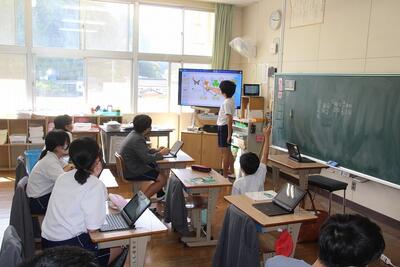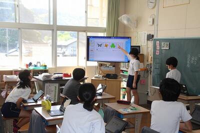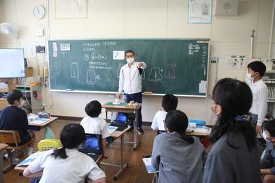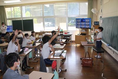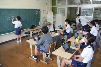 算数科では、対称な図形の学習に入りました。この日は、4つの図を仲間分けする学習でした。学習リーダーを中心にして、自分たちで学習を進めました。自分の考えをモニターに映して説明している姿を見て、さすが6年生だなと感心しました。