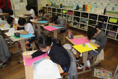 図工科では、回る仕組みから表したいことを見付け、形や色などの感じを捉えながら、前学年までの経験を生かして表し方を工夫し、楽しく表す学習をしています。どんなものが完成するのか、とても楽しみです。