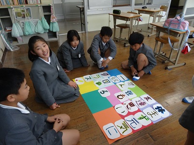 24日月曜日の2時間目、体育館で1.2年生の交流会をしました。2年生が企画、司会をし、ゲームや朝顔の種の贈呈などをしました。
