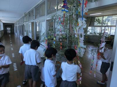 本校のホールに笹飾りが完成しました。最初に1年生が飾り付けや願い事の短冊をつけて、それに2年生やそのほかの学年が加わってできあがりました。