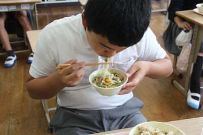 フルーツ白玉の中には、星形のカクテルゼリーが入っています。冷たくて甘くて暑い夏にぴったりなフルーツです。おいしい給食を食べながら、星に願い事をする東陽っ子です。