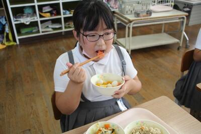 この日の給食メニューは、牛ごぼうごはん、魚そうめん汁、フルーツ白玉、牛乳です。