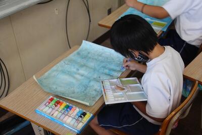 図画工作科では、読書感想画に取り組んでいます。工藤直子作「ともだちは海のにおい」という物語を読んで、心に残った場面を思い思いに表現していきます。登場人物のクジラとイルカをタブレットで調べて、下がきをしました。この日は、場面に合う色を探して丁寧に塗っていきました。もうすぐ完成です。