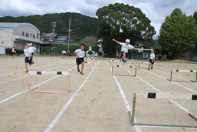 体育科ではハードル走の学習をしています。この日の学習課題は、「低く跳ぶためにはどうすればよいか」でした。跳ぶときに体を前に倒す、ハードルの少し前から跳ぶ、片足ジャンプする、膝の力を使うなど、子どもたちから考えが出ました。それを自分で確かめました。