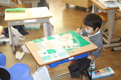 図工科では、けんばんハーモニカをひく自分を絵に表しています。人やけんばんはクレパスで、背景は絵の具で塗りました。今にも動き出しそうな作品を仕上げました。教室の後方に掲示しています。