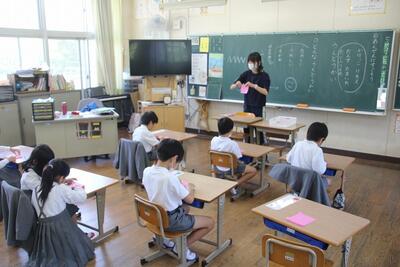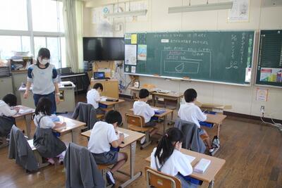 国語科では、詩を声に出して読む学習を行いました。語のまとまりや言葉の響きに気をつけて音読し、朝日や海の様子の内容の大体を捉える活動を行いました。教科書の題名の横に◯をかいて、読んだ回数を⚫になるように鉛筆で塗っていきました。これから家庭学習に音読の練習が始まる予定です。