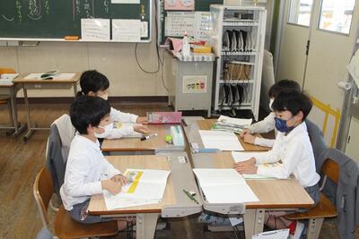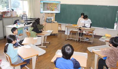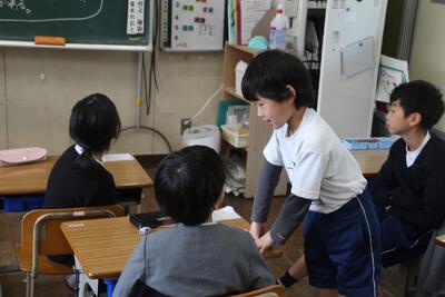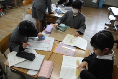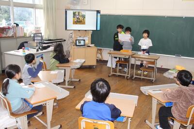 国語科では、わたしたちの学校じまんについて1・2年生に発表しました。人のつながりの強さのこと、給食のこと、自然豊かなことなどについて、スライドを使って分かりやすく伝えました。発表後には1・2年生から感想のお返しがあり、とても喜んでいました。
