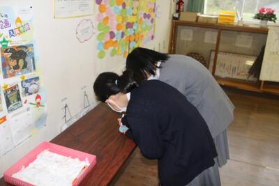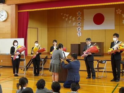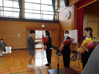 退任式を行い、5人の先生方とお別れしました。校長先生の紹介の後、転出する先生のお別れの言葉がありました。東陽っ子の中には涙を流している人がいて、お別れするのがとてもつらかったです。児童代表5年生のお礼の言葉と花束贈呈を行い、その後みんなで校歌を歌い、地域の上村さんに記念撮影をしてもらいました。お別れするのはとても寂しいですが、5人の先生方から教えていただいたことや楽しかった思い出を背負って、一歩前に踏み出しましょう。東陽小学校のために力を尽くしていただいた5人の先生方、ありがとうございました。