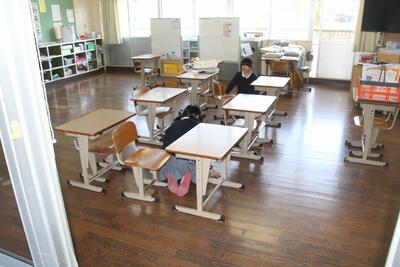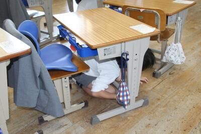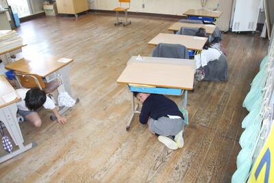 東日本大震災から13年が経ち、今の小学生は映像等でしかこの震災のことを知らない世代になりました。3月15日にシェイクアウト訓練を行いました。通常の避難訓練は授業中に行うことが多いですが、今回は掃除時間に行いました。近くに先生がいない児童の動きを観察しました。緊急放送が始まると、すぐに机の下などに入り、頭を守る「ダンゴムシのポーズ」で揺れがおさまるまで待機することができました。その後、自分の近くの出入り口から屋外に避難することができました。予告なしのシェイクアウト訓練でしたが、東陽っ子は自分の命を守る行動をとることができました。