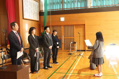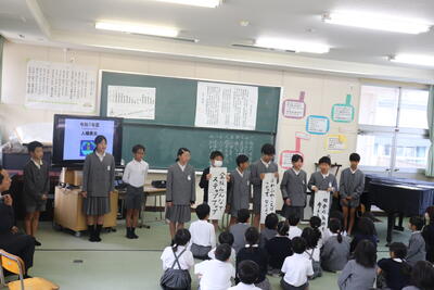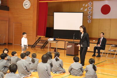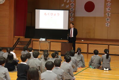 学校のリーダーである6年生から在校生に人権目標を提示した後、校長先生から講話がありました。