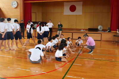 団体競技では、縦割り班で八の字跳びにチャレンジしました。