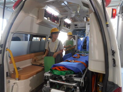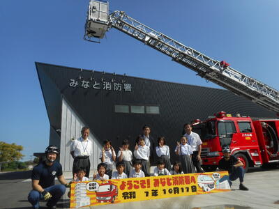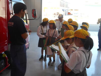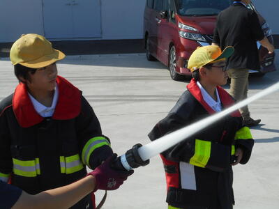 ここでは、消防車両の見学や消火訓練等を行いました。