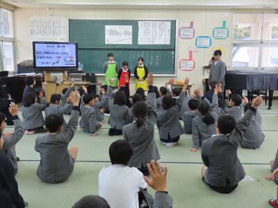 栄養教諭からは、給食の歴史や残食のこと、「まごわやさしい」についての説明がありました。