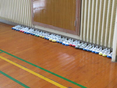 「履いている上靴を体育館の端に置いて来てください。」との琴臣さんの指示に、子供たちは靴をおいて、元の場所に戻ります。子どもが去った後には、きちんと揃えている靴もあれば、飛び出した靴、反対を向いた靴も・・・