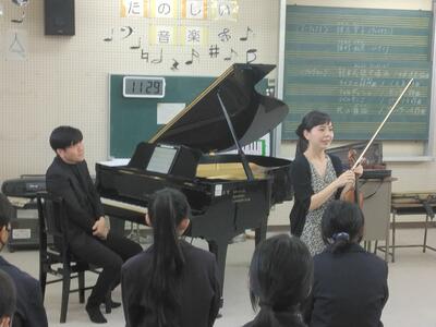 来校いただいたのは、ヴァイオリニスト緒方愛子さん、ピアニスト上村和彦さんです。