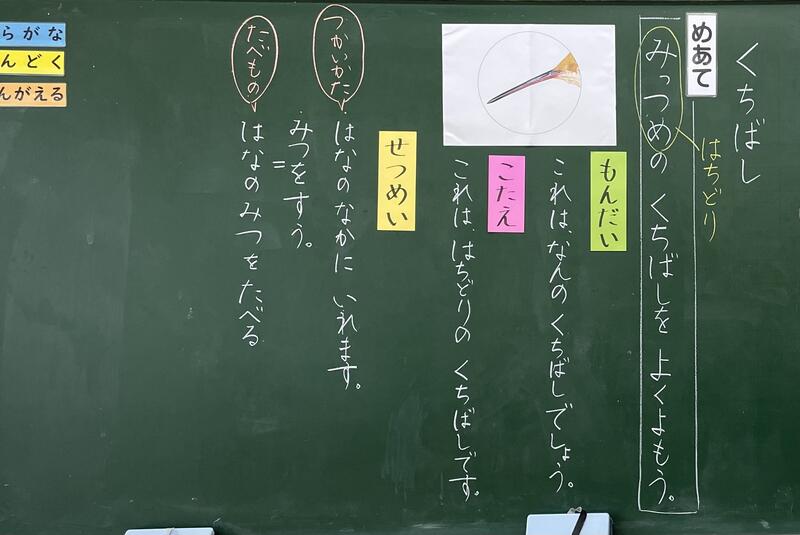 今、国語で「くちばし」を読んでいます。いろいろな鳥のくちばしの形について書かれた説明文です。話には3つのくちばしが出てきます。今日は3つめのくちばしを読みました。ハチドリのくちばしについて書かれているのですが、私も初めて知ることばかりで勉強になります。文章を読んだ後は、くちばしをどんな風に使っているのかを確かめています。ICT機器があってより分かりやすくて便利だなあと感じているところです。今後は一番驚いたくちばしについて話したり、自分たちでくちばしクイズをつくったりします。