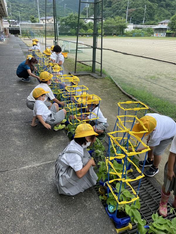 今日は、朝から雨が降っていたので、子供たちからも「びしょびしょだ~」という声が聞こえました。昼前には雨も止んできたので、あさがおの観察も無事できました。つるがだいぶ伸びてきたので、友達のあさがおとからまないために、支柱を立てました。どんどん大きくなるあさがおに、子供たちもいつも「すごい!」と言っています。花が咲くまでもう少し、楽しみです。