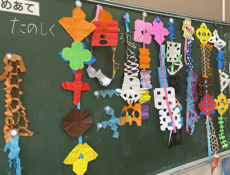 今日は、図工で「チョッキン パッで かざろう」の学習をしました。折り紙を折り曲げてはさみで切り、開いたときにどんな形ができるかを楽しむ学習です。いろんな折り方、切り方を試して、すてきな飾りができました。