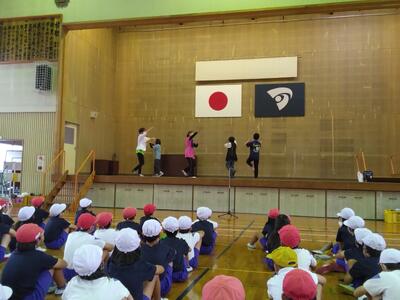 棒踊り保存会の方々に教えていただいた中学年の表現。保存会の方の生歌に合わせて披露できました。