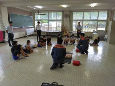 少年消防クラブ。今回は心肺蘇生法訓練。芦北消防署の方のお話を真剣に聞いています。このあと、実際に体験しました(`_´)b