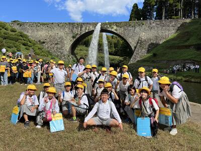 通潤橋の放水をバックに記念撮影 現地に出かけて、有意義な学びとなりました。