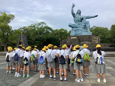 平和祈念像の前で。