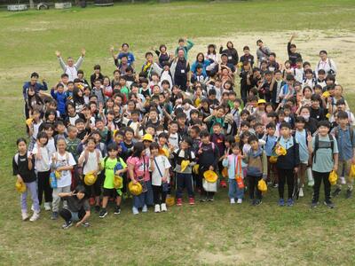 全児童でゲーム。心をひとつにして、「せ~の! 前!」「後ろ!」