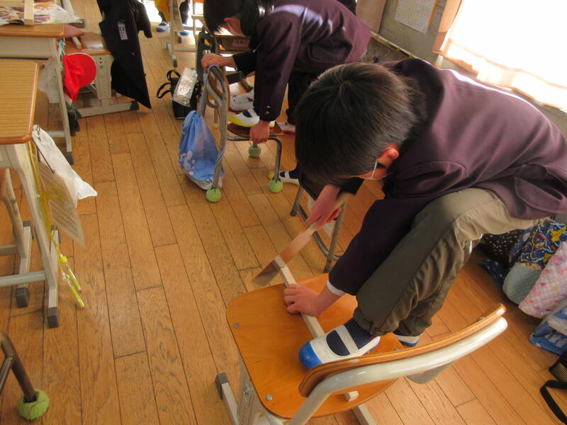 3年生が図工の時間にのこぎりで木を切ることに挑戦しています。間隔をあけて換気をしながら取り組んでいます。