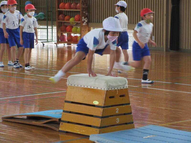 2年生が体育館で跳び箱の授業をしていました。みんな、マスク着用のまま、練習に励んでいます。ちょっと練習すると、みるみる上達するのですごいなぁと思います。