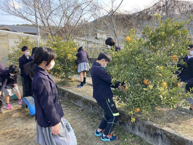 5年生が総合的な学習の時間に調べたり育てたりしていた芦北町特産の「甘夏」。地域の方のご協力もあって、無事に収穫ができました。