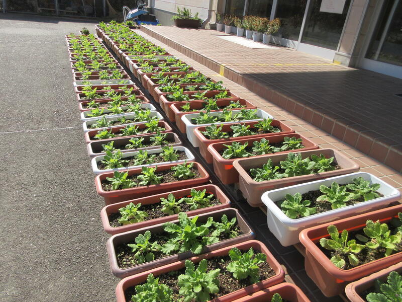 体育館前にずらりと並んだサクラソウ。職員がタネから育てました。プランターに植えた後のポット苗を、先日全児童に2個ずつ差し上げました。ご家庭でも育ててくださると嬉しいです。