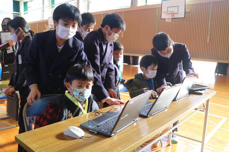 2月16日(木)、新一年生の体験入学を実施しました。これは、5年生が作ったプログラムでゲームをしている様子です。こんな時代になりました・・・。