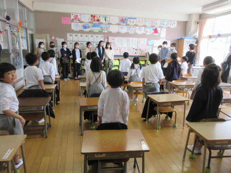 4月28日、今年度初めての授業参観を行いました。これは1年生教室で、授業前に、「校歌」を歌っている様子です。1年生もずいぶん学校生活に慣れてきました。頑張っています。