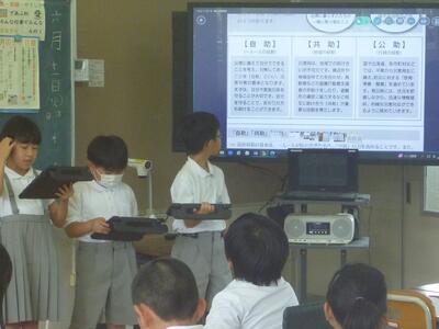 まずは、グループに分かれて調べたことをタブレットを使って発表しました。