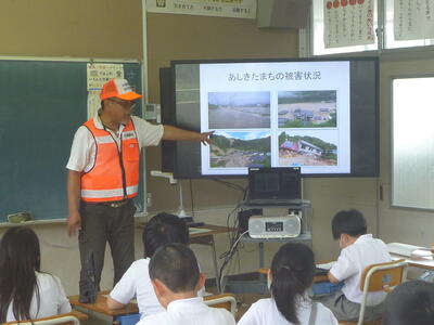 山田さんに質問したいことを伝えて答えていただきました。さらに、地区の被害状況や様子についても話していただきました。みんな真剣な表情でメモをとりながら聞いています。
