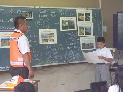 山田さんにお礼を述べる児童。これからも防災や災害に備えた学習をがんばります!