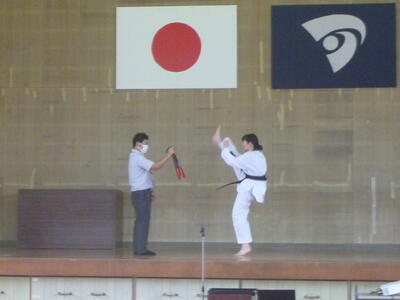 6月全校集会では、山下先生に登場してもらいました。学生時代に頑張ったテコンドーの演舞や足技を披露し、インタビューにも答えてもらいました。