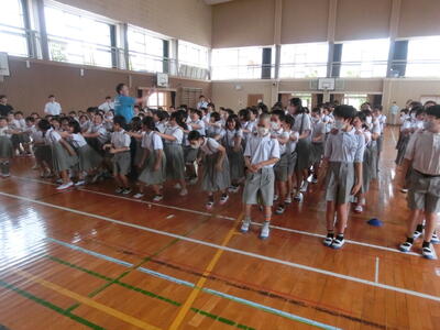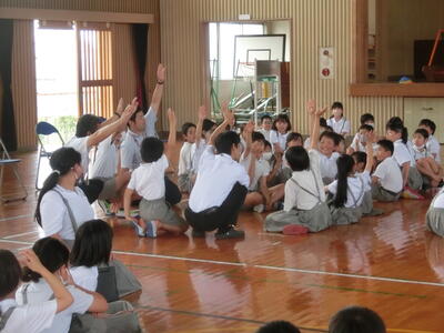 全児童でゲーム。心をひとつにして、「せ~の! 前!」「後ろ!」