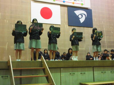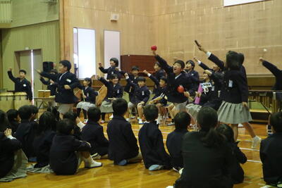 「朝のあいさつをしましょう!」「おはようございます!!!」1年生は、「まなんで、あそんで、げんき!」のテーマで、とても元気な1日様子を紹介しました。