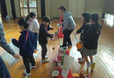 2年生と1年生は、近くの保育園の年長のみなさんをお招きして、「お楽しみ交流会」を開催しました。園児さんたちには、手作りチケットを配って、お店まわりをしてもらいます(^^ゞ