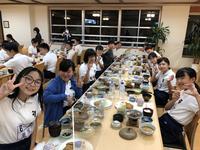 夕食です。食堂では席の間隔を空けて座っています。みんなで食べる食事の味は格別です。