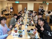 昼食です。みんなもりもり食べています。午後はマリン活動で海水浴、磯観察です。
