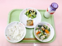 今日は、鶏肉をしょうがとにんにくのたれに漬け込んで焼いた、「鶏肉の香味焼き」があります。しょうがの風味とにんにくの味がしっかりしているので、食欲が増しいつもより早く食べることができると思います。きちんと三角食べをしながら、残さないように食べてください。