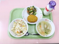 牛乳、チキンライス、わかめスープ、やさいコロッケ、ドレッシングサラダ