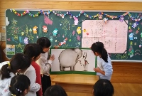 今日3・4年生の子どもたちは、沖先生、ルーシー先生と一緒にスマイルタイムの学習を頑張りました。4年生は、「In the Autum Forest」というお話をもとに、動物、体の部分、形容詞などを楽しく学習しています。今日は、ジェスチャーを取り入れた楽しいゲームで大盛り上がりでした。