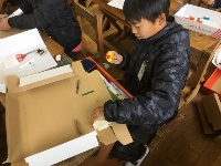 今、5年生の図画工作では、「段ボールアート」を作っています。段ボールを使って壁を作ったり、トンネルを作ったりして、箱の中にビー玉のオリジナル迷路を作ります。